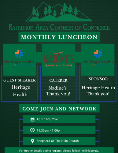 Each month the Rathdrum Area Chamber of Commerce and our members get together for a monthly networking luncheon. The Chamber's Monthly Luncheons are a great opportunity to make business connections with other business leaders in the area. Each month is educational and completely different, so you'll want to mark your calendars for the third Thursday of the month and plan to attend each month. Please join us this month on Thursday, March 19 2026, from 11:30 AM to 1:00 PM at Shepherd of the Hills Church.